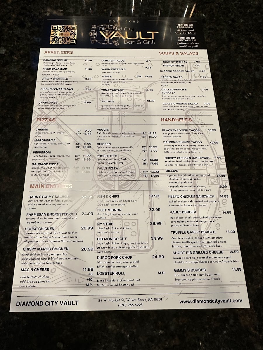 Welcome to the Diamond City Vault Bar&Grill, where gastronomic delights meet an inviting atmosphere in Wilkes-Barre, PA. Nestled in a historic bank setting, this restaurant offers a menu that ignites the senses. From their wood-fired pizzas to hearty entrees, each dish is crafted to perfection. You must try the Vault Pizza, featuring fresh mozzarella, spinach, and roasted tomatoes, or the classic pepperoni for a comforting staple.
